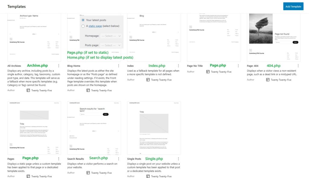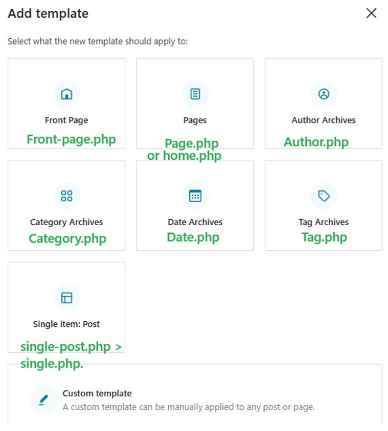 Every Template in wordpress has a corresponding php file. I have added the php files that each template uses. Below is a table with further explanations for each template.